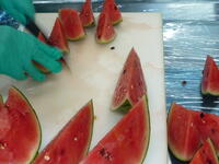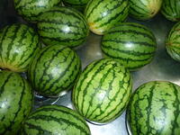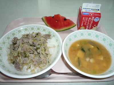献立: ご飯、牛乳、ねぎ塩豚丼の具、さつま汁、小玉すいか(茨城県産)