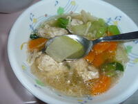今日のスープは、沖縄産の冬瓜を使いました。冬瓜は、濃い緑色をした楕円形の野菜です。調理員さんが一生懸命、冬瓜の堅い皮を剥いてくれました。緑色の皮を剥くと、中身は白い色をしています。火が通ると、透き通った色になります。