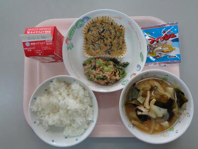 本日、主菜の「ちぐさ焼き」は、溶き卵に細かく刻んだ複数の材料を加えて焼き上げた料理です。ひじきも入っており、成長期に欠かせない鉄分の補給にも最適でした。