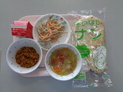 本日の給食の献立は、ナン(乳なし)、牛乳、ドライカレー、ゴボウサラダ、ポトフ(鶏肉、ジャガイモ、キャベツ 千葉県産 )でした。