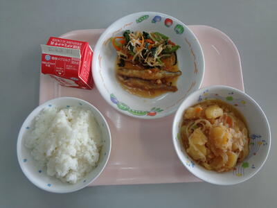 本日の給食の献立は、ご飯(黒酢米 野田産)、ワカサギの南蛮漬け(ネギ 千葉県産)、おかか和え(小松菜 野田産)、じゃがいものそぼろ煮(鶏肉、じゃがいも 千葉県産)でした。じゃいがいもは今でこそ馴染みのある食材となりましたが、原産地はアンデスからメキシコにかけた地方だそうです。根菜のようですが、茎に養分を蓄えている部分だそうです。