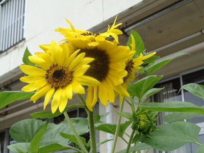 <職員室前の早咲きの向日葵>
