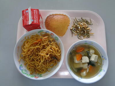 本日の給食の献立は、豚キムチ焼きそば、牛乳、豆腐スープ、米粉のカステラ、アーモンドと小魚でした。野田市産の食材は、米粉、小松菜、卵でした。また、千葉県産の食材は、鶏肉、人参、キャベツでした。