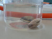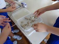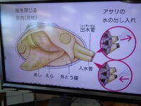 殻を開き中をよく見ていくと、貝柱(閉殻筋)、出水管、入水管などをはっきりと見ることができました。本日は、アサリの解剖実験の様子をご紹介致します。