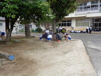 <花壇の周辺を手入れする生徒> <校庭の掃き掃除> <駐車場の雑草処理>
