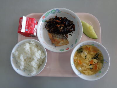 食育月間の初日の献立は、ご飯(野田産黒酢米)、牛乳、鯖のピリ辛焼き、ひじきの炒め煮、かき玉汁、メロンでした。今月の19日の食育の日は、野田産の食材をたくさん使用した献立となっています。楽しみにしていただければと思います。
