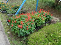 <サルビア(公民館より)> <マリーゴールドとペチュニア> <ボランティアの様子1>