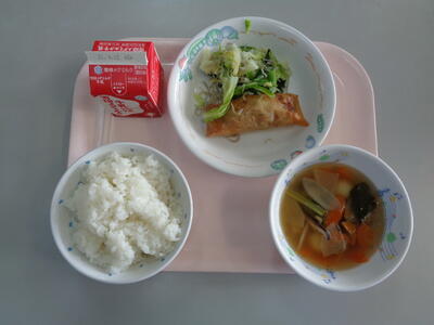 食育月間となる6月ですが、本日の献立は、ご飯(野田産の黒酢米)、牛乳、手作り春巻き、キャベツとじゃこの和え物(野田産の小松菜)、中華風白玉スープでした。写真でご紹介致します。