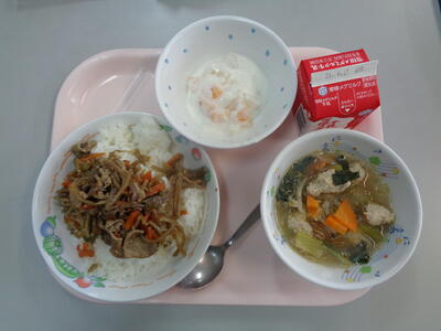 食育月間の4回目の給食となりました。本日の献立は、きんぴら丼(ご飯は、野田産の黒酢米)、牛乳、冬瓜と肉団子のスープ(野田産の小松菜)、フルーツヨーグルト(もも、パイン)でした。