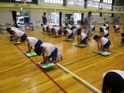 例年、野田市消防本部の方たちが学校に来てくださり、2年生を対象に応急手当講習会を行い、直接「救命」について指導してくださいます。今年度は7月5日に体育館で実施しました。