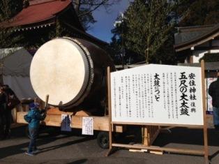 なかなかお目にかかれない大きな和太鼓!みんなで叩いて安住神社を応援しましょう