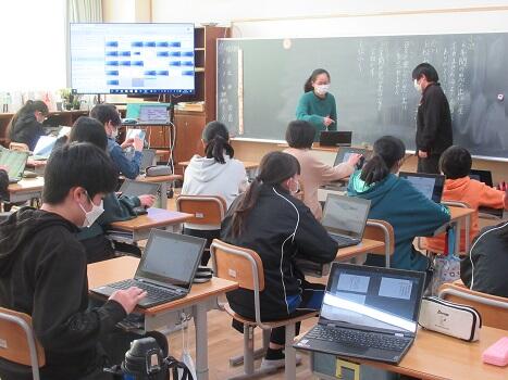 5年生、総合的な学習の時間です。発表会の練習をしています。