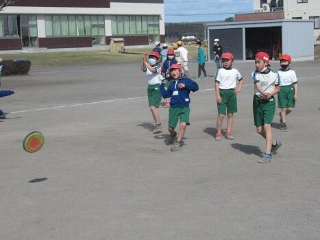 4年生、体育の授業です。ドッヂビーを2つ使って、ゲームを楽しんでします。