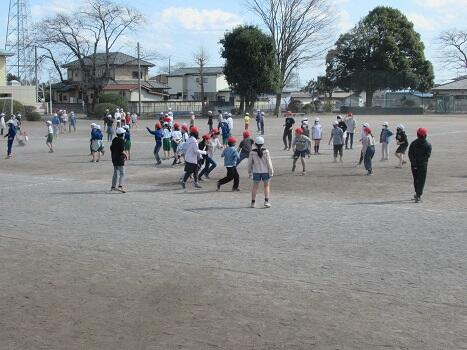 かみまつタイムは、学級の時間でした。低学年と高学年が外で元気に遊びました。低学年が遊んでいる様子です。