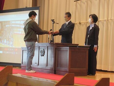 令和3年度修了式をリモートで実施しました。会議室で、各学年の代表児童に修了証書・進級祝賞を授与した後、作文発表を行いました。どの学年の代表児童も、今年度を振り返り、来年度の目標をしっかり立てていました。