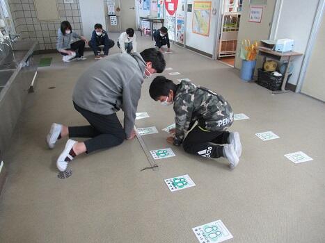 6年生が、水道を使うときに距離を保つための足形を作り、貼ってくれています。ありがとうございます。