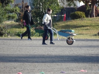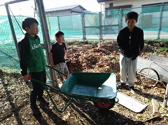 校庭や教材園、校庭の隅々に積もっている落ち葉を、全校生のパワーできれいにしました。