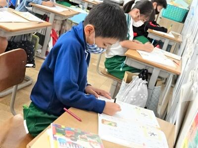 【2年生】1枚目の写真は、学級活動の時間に2学期の目標を考え、「かみまつっこせんげん」のカードに記入している様子です。学習面や生活面の視点ごとに目標を決めます。目標に向かって頑張る姿を応援したいと思います。