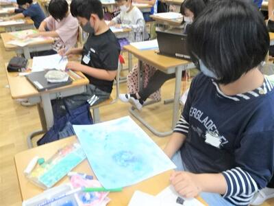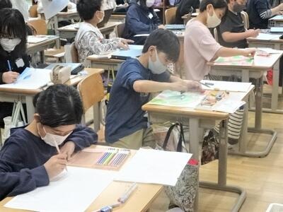 6年生の教室があまりに静かなのでのぞいてみると、「音のする絵」という単元の作品作りを行っていました。音やリズムなどの目に見えないものを、形や色で想像を広げて表現するという内容です。はじめは戸惑っていた子どもたちも、音やリズムを想像しながら、下書き、水彩と広げていきました。子どもたちの表現力ってすごいですね。