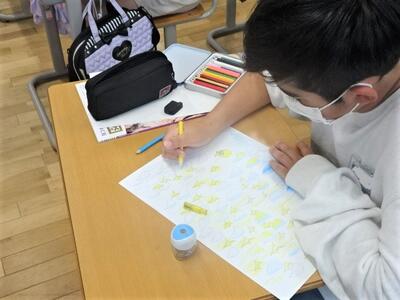 【4年生】1枚目の写真は、図工の「まぼろしの花」という題材の学習です。まぼろしの花という言葉から想像した「花」を描いていくのです。だいぶ完成に近づいてきています。子どもたちの想像力ってすごいんですね。完成が楽しみです。