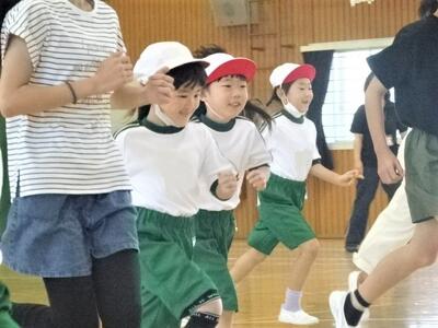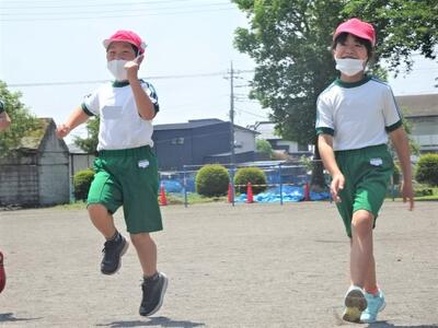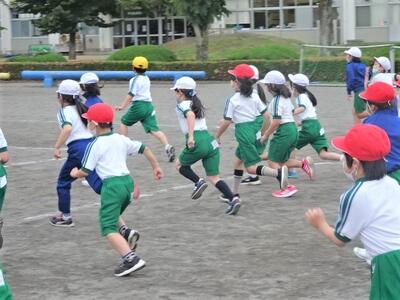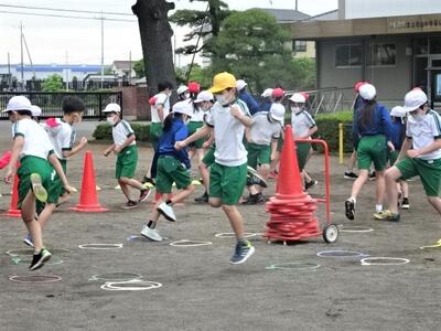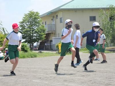【1年生】2枚目の写真は、6年生に手伝ってもらいながら、シャトルランの想定をした時の写真です。6年生に付き添ってもらいながら、自分の力をしっかり出して走っていました。