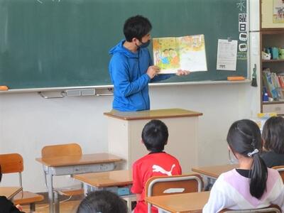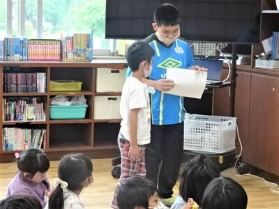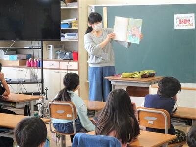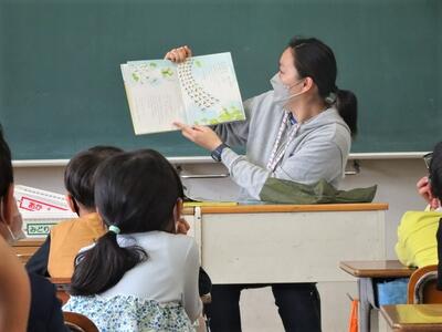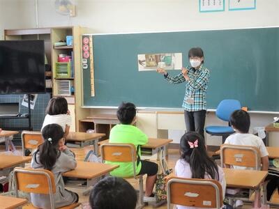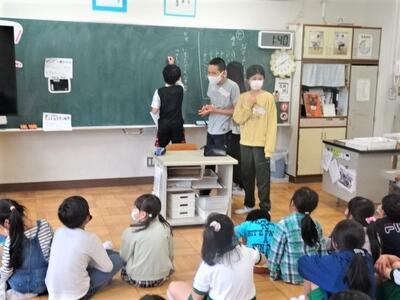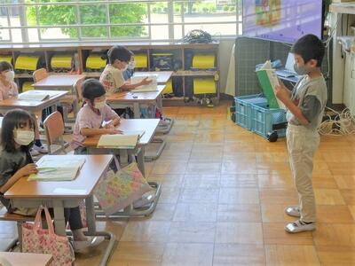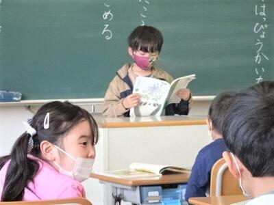 【1年生】1枚目の写真は、国語の時間に「おおきなかぶ」の朗読劇の発表の様子です。ちょうど、かぶが抜けて喜んでいる場面ですね。しっかりと台詞を言いながら動作化をすることができました。