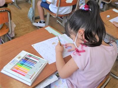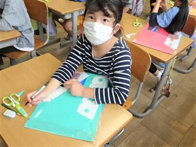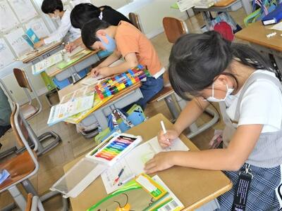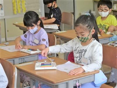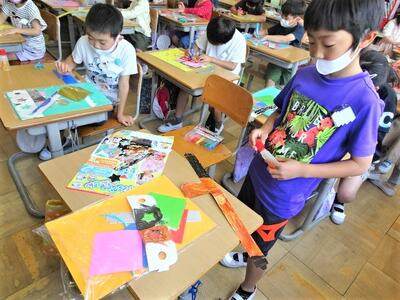 【2年生】1枚目と2枚目の写真は、図工の時間にカラフルなうちわを作っている様子です。1枚目は、デザインの下書きをしているところで、2枚目は下絵をもとにセロファンを貼りだした場面です。色を重ねながら、工夫をしています。