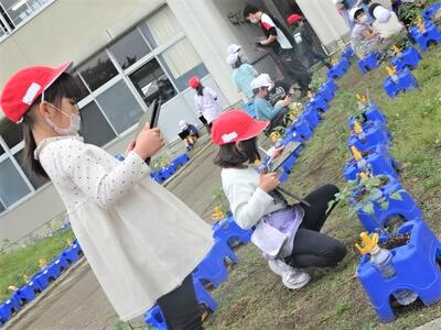 【3年生】2枚目の写真は、社会科の「学校の周りの様子」の学習で、学校の南西側を散策してる様子です。昨日に引き続き、1クラスで実施しました。理科で蒔いた花の芽も出て、成長の様子を観察してワークシートに残しています。