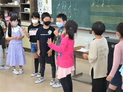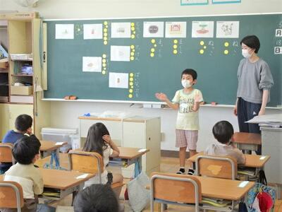 【1年生】1枚目の写真は、国語の時間に「おおきなかぶ」のグループ発表の練習をしている場面です。各グループの役割に応じて、台詞の確認をしているのです。また、4名目の写真は、音楽の時間に「うみ」の曲調に合わせて身体表現をしているところです。