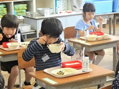 おはようございます。朝、六時に起床し、朝食をいただいています。子どもたちは、朝から元気で、しっかりもりもりと食べています。