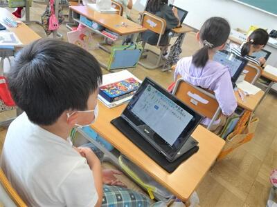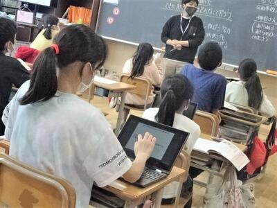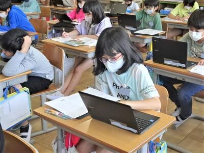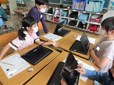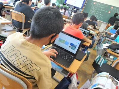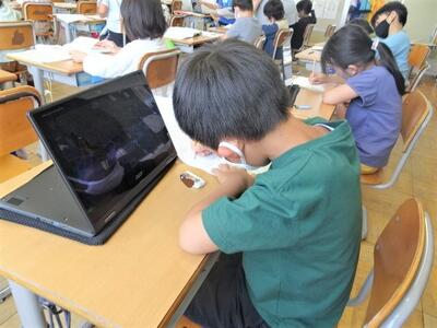 【5年生】1枚目の写真は、理科の時間に「自由研究(学校で調べていたもの)」のまとめをしている場面です。7~9枚のシートを、一つのシートにまとめていきます。子どもたちのパソコンのスキルは、上がる一方です。