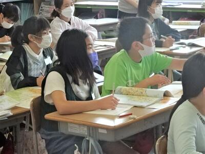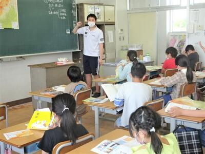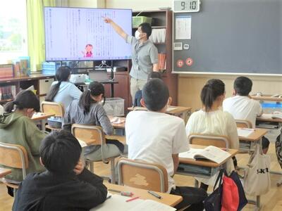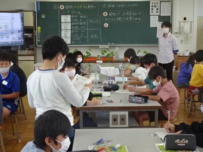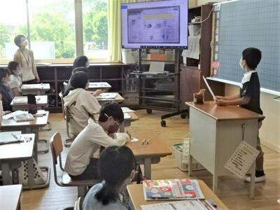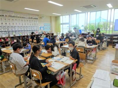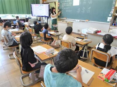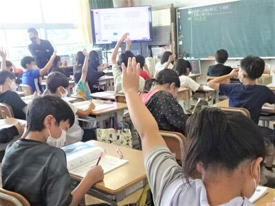 【5年生】1枚目の写真は、「米づくりがさかんな地域」の学習をしている様子です。米作りのさかんな地域や、米の生産量の少ない地域について、棚田等の地形的な条件が影響をしていることを考えることができました。