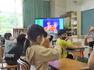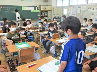 【3年生】1枚目と2枚目の写真は、外国語活動の授業の様子です。「元気」や「眠い」「悲しい」などの相手の状態を聞いたり答えたりする内容です。子どもたちは、すぐに会話の仕方を覚えて、進んで友達と会話の練習をしていました。