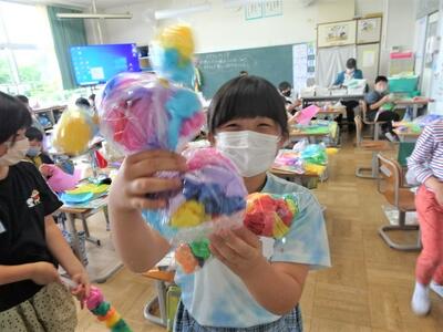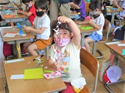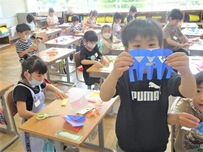 1年生の教室で子どもたちが楽しそうに折り紙の飾りを作っていました。通りかかると、「これ見て」とできた飾りをたくさん見せてくれました。図工の「ちょきちょきかざり」という単元の学習です。はさみを上手に使いながらきれいな飾りを作ることができました。