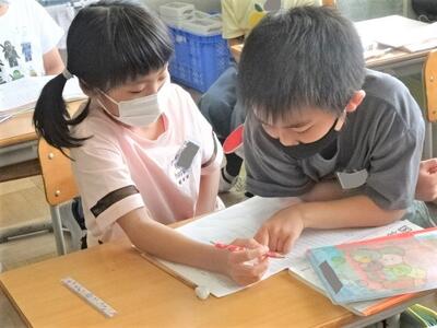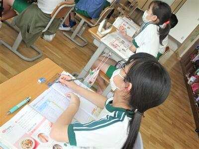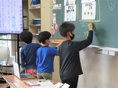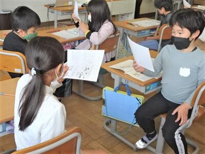 【1年生】1枚目の写真は、国語の時間に話し合い活動を楽しそうに行っている様子です。「おおきな かぶ」の教材文に入り、役割を決めて音読をするために、だれが何の役になるかを話し合っているのです。楽しそうですが、子どもたちは真剣でした。