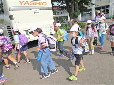 今日から1泊2日で、4年生の宿泊学習を実施します。行き先は、なす高原自然の家です。初めての宿泊を伴う学習です。これまで、事前指導を念入りに行ってきました。いつもより少し早めに集まった4年生、しっかりと出発式を行い、自然の家に向けて出発しました。