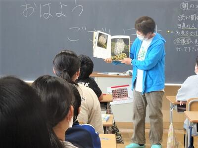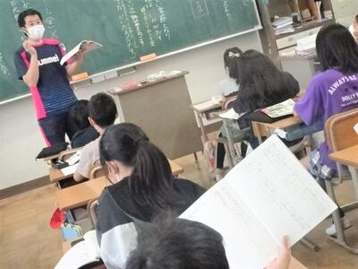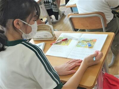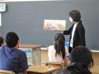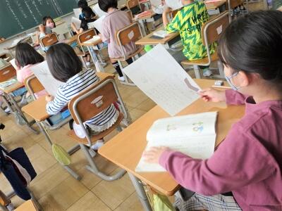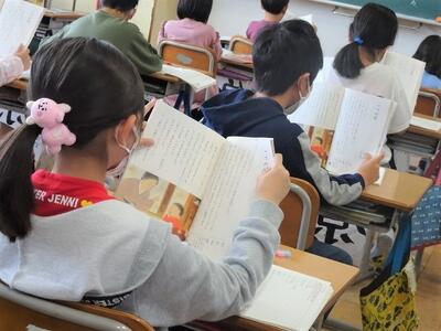 【4年生】1枚目と2枚目の写真は、国語の「自分の考えをつたえるには」の学習をしている場面です。アフガニスタンにラドセルを送る活動に関する教材文を読んでいます。段落の整理しながら説明文の構成を知り、意見文につなげていきます。