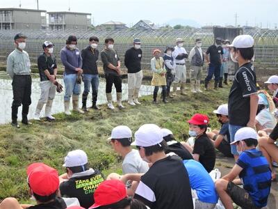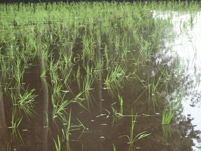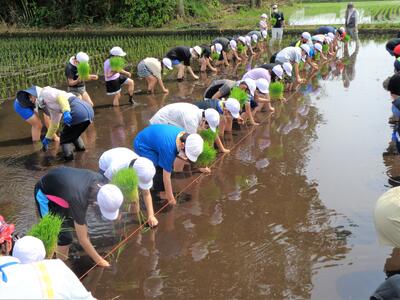 5年生の総合的な学習の時間の一つに「米作りに挑戦しよう」という単元があります。本校の東側は稲作が盛んであり、本校の特色ある行事にもなっています。この単元では、田植えから稲刈り、収穫後の食事までを体験することで、農業に携わる人々の苦労や喜びを味わいながら、お米についての理解を深めることを目的としています。今日は、しっかりと田植えを体験することができました。
