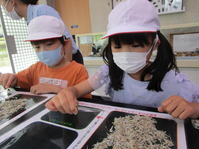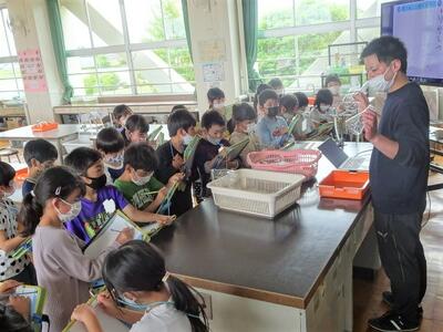 【5年生】1枚目の写真は、これまでに学習した知識をいかして、実際のメダタの雄雌を見分ける活動をしています。子どもたちは見分け方を理解していて、すぐに「こっちが雄で、こっちが雌」と伝え合っていました。