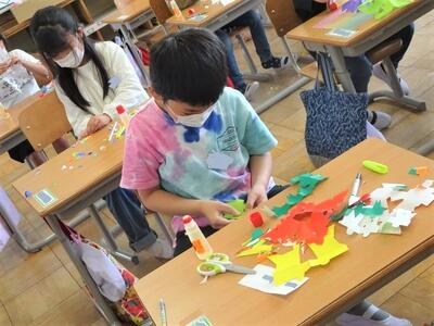 【1年生】1枚目と2枚目の写真は、図画工作の時間に折り紙を使っていろいろな模様を作っている活動の様子です。はさみを上手に使いながら素敵な作品を作ることができました。できあがった作品は、後日、特集してお伝えします。