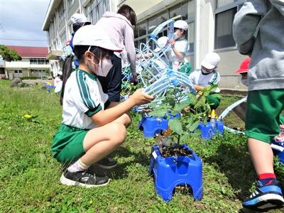 【2年生】生活科で育てている野菜の観察です。ミニトマトなどは生長が早く、もう収穫して持ち帰っています。トウガラシも赤く熟していました。まだ収穫をしていない野菜も、もうすぐに収穫できそうです。