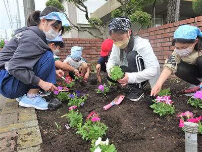 【かみまつタイム】清掃の時間に、各学年の代表の児童が緑化活動を行いました。校舎の前の花壇に、きれいな花が植えられました。