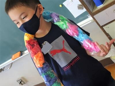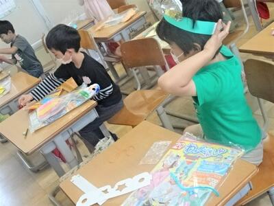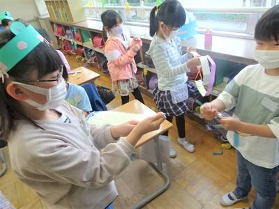 【2年生】2年生も新体力テストの測定に挑戦していました。シャトルランは、5年生が数えるのを手伝ってくれました。図工の「わっかでへんしん」では、上手な飾りをつけていてファッションショーのようでした。