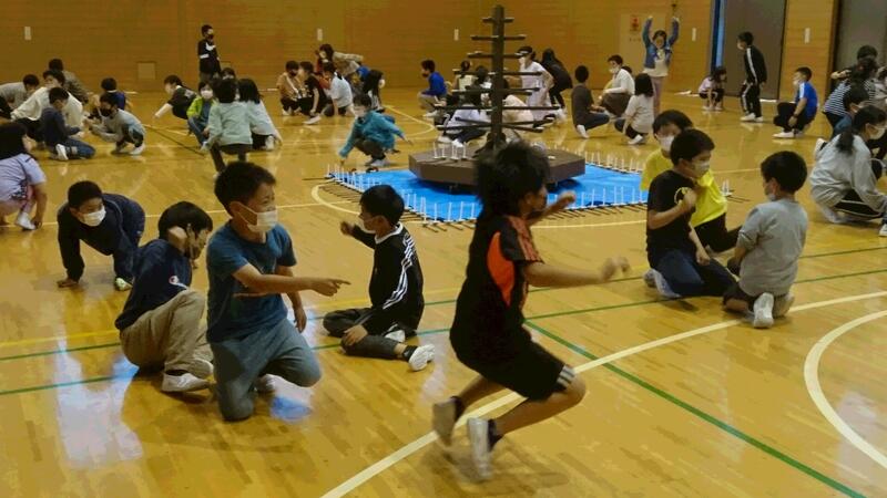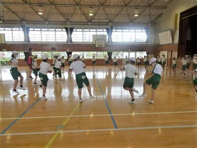 【2年生】1枚目の写真は、音楽の時間の写真です。曲に合わせて、忍び足で屋敷に近づいている場面です。曲調に合わせて体全体を使って表現しています。ボール投げにもしっかり取り組んでいました。