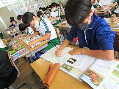 【6年生】1枚目の写真は、国語の「町のよさを伝えるパンフレットを作ろう」という単元の学習です。全体の構成を考えたり、見出しやリード文を入れたりと、学級したことを生かしてパンフレット作りを行っていました。