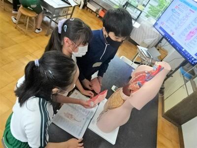 【5年生】1・2枚目の写真は、理科の学習でメダカのたまごを電子顕微鏡で見ている様子です。倍率をあげていくと、たまごの中の心臓が動いているところも見ることができました。