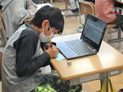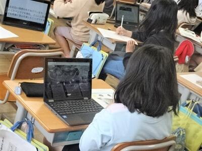 【4年生】1枚目の写真は、昨日学習をしてきた「エコパークしおや」をまとめた友達の作品を見て、感想をロイロノートにまとめているところです。友達の作品のよさがしっかりと書き込まれていました。