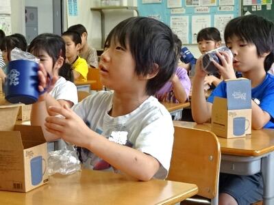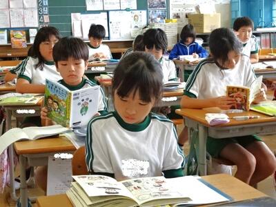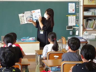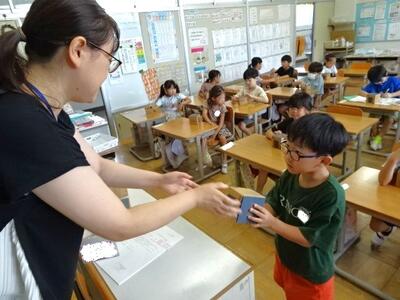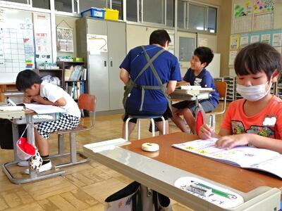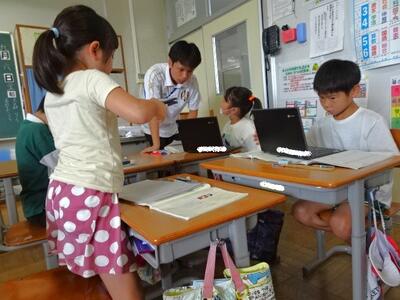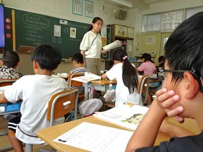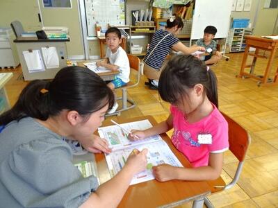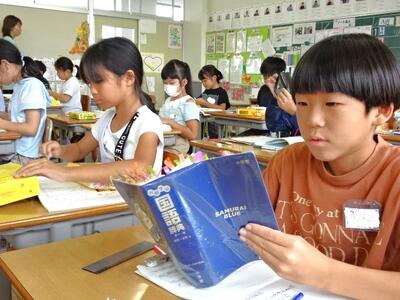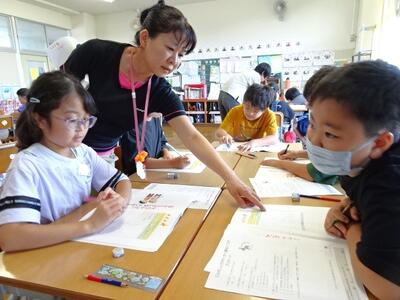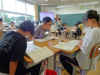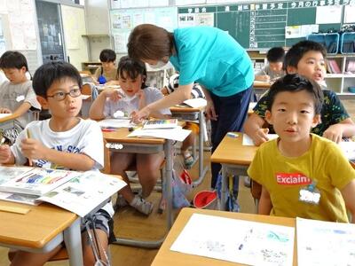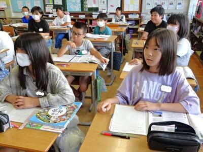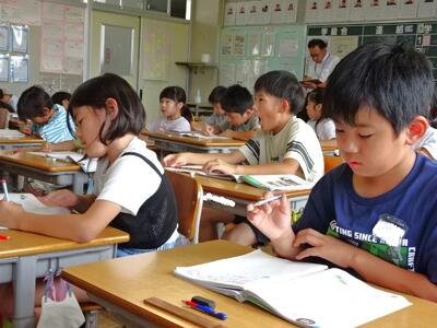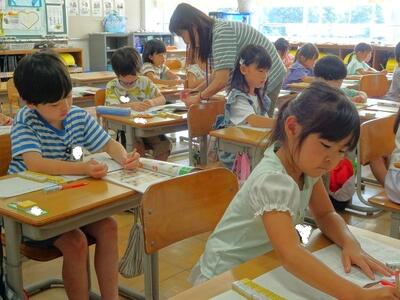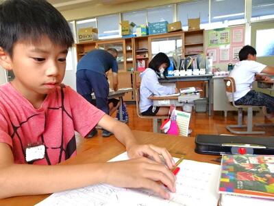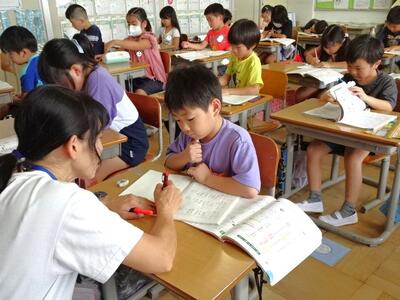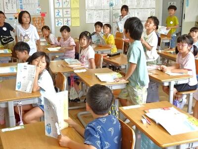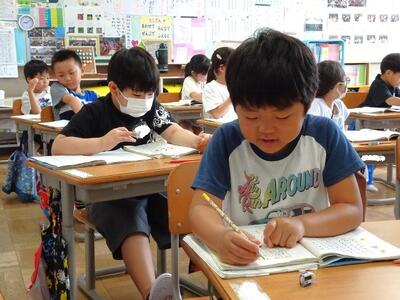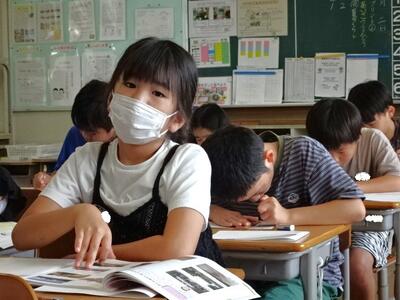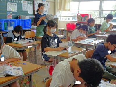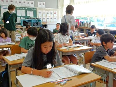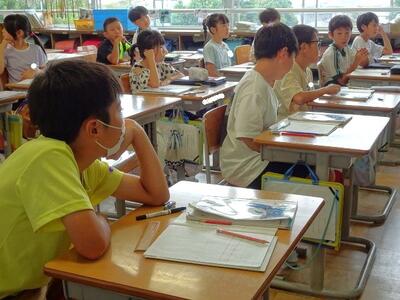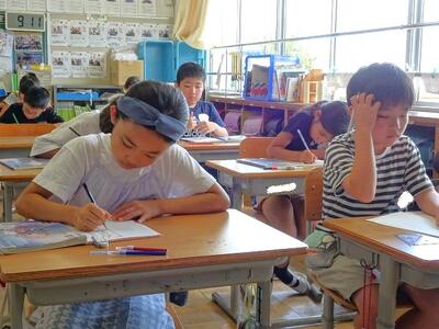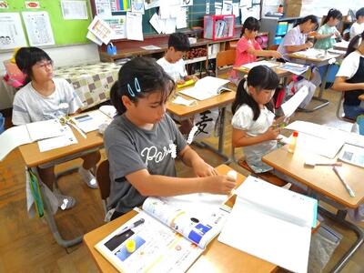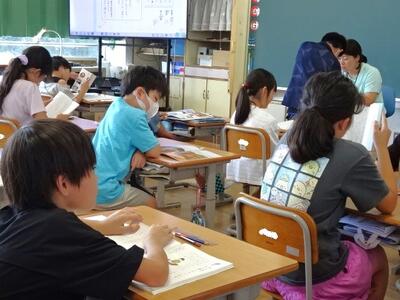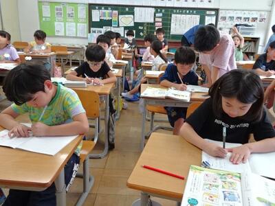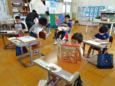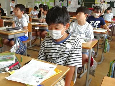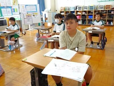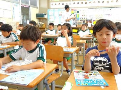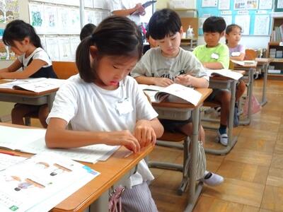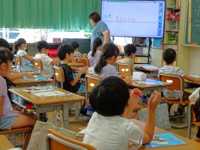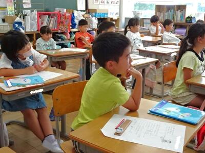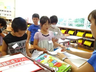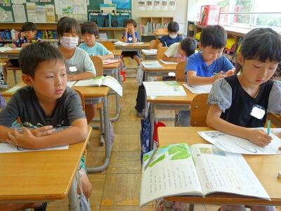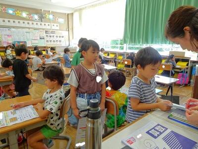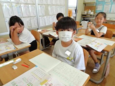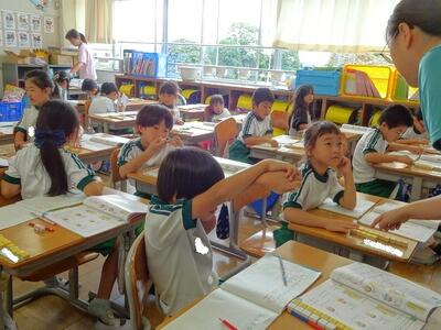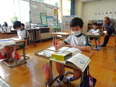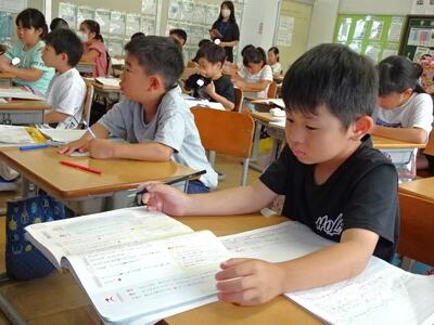 【1年生】夏休みあけ、1年生の教室では新しい教科書やドリルが配られていました。名前を書いたり、中身をチラチラと見たりしながら、先生と一緒に確認をしていました。