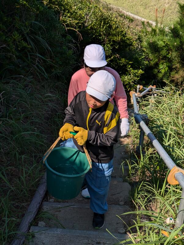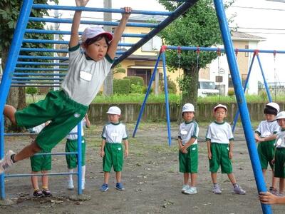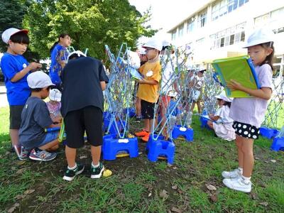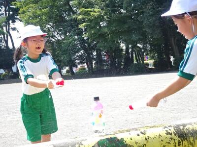 【1年生】1枚目と2枚目の写真は、生活科の「みずであそぼう」の学習の様子です。自分たちで的を作り、鉄棒や雲梯に結びつけで準備完了です。後は容器にしっかりと水を入れて、的を狙って水を発射させていました。