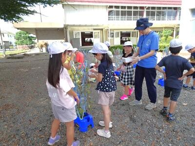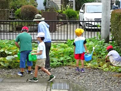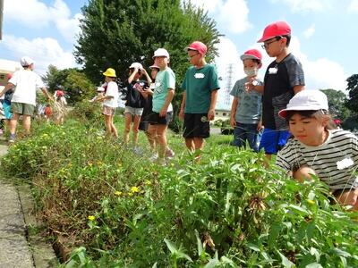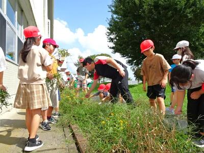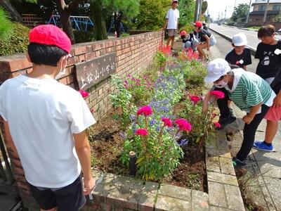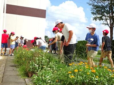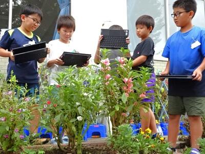 【3年生】1枚目の写真は、理科の「花のかんさつ」の学習の様子です。春に種から育てたホウセンカも、夏休みの間にすっかり大きくなっていました。しっかりと写真に残しておきます。